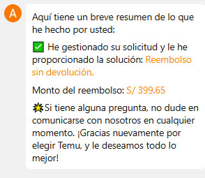 Luego de algunos minutos la encargada de Atención al Cliente de Temu me dio la razón y me dijo finalmente que mi dinero me seria reembolsado, dándome 2 opciones:
